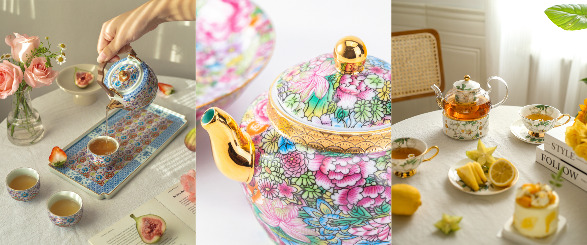 Falangcai Blossom — Wooden Handle Ceramic Teapot Set with Tray