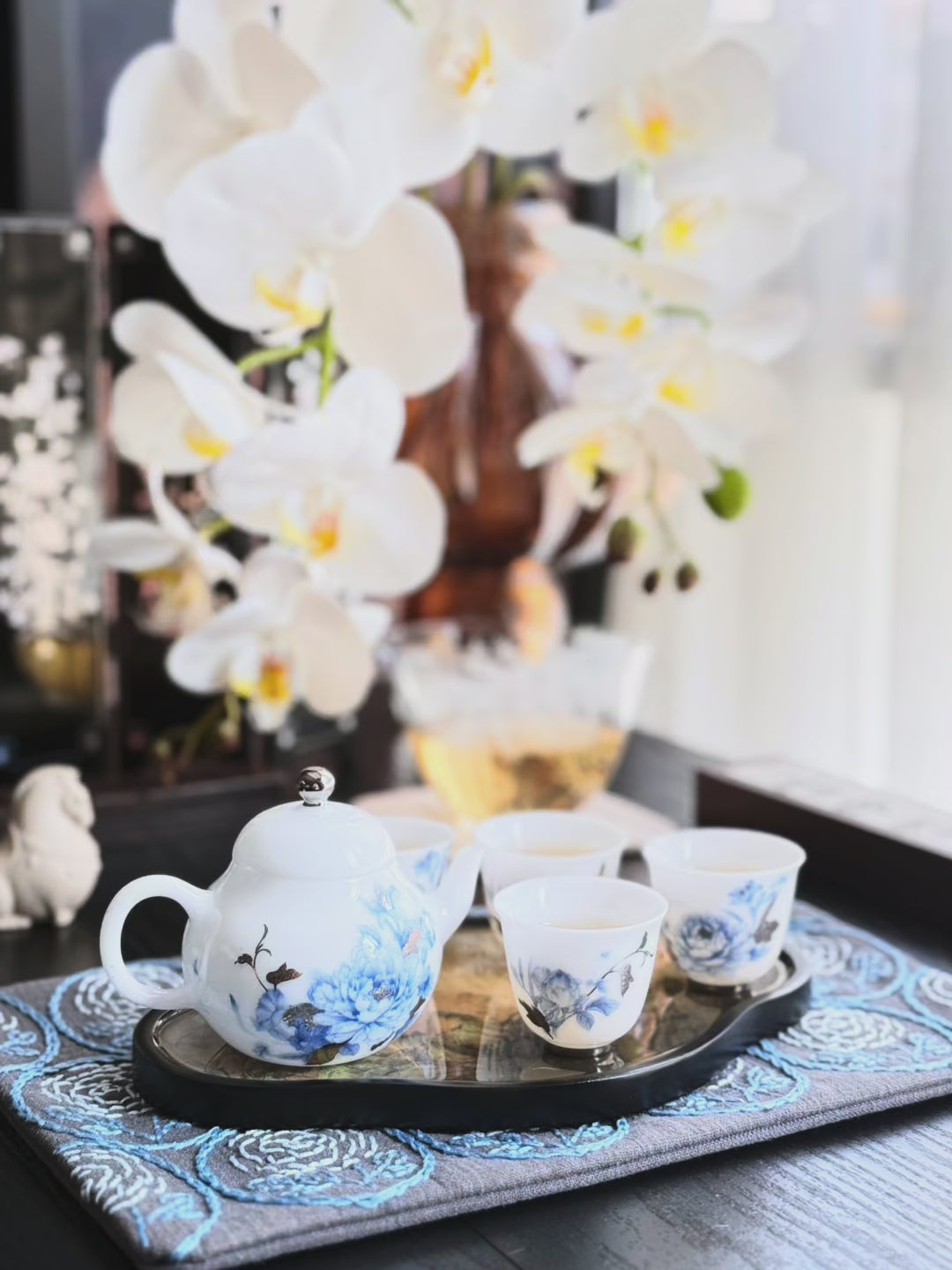 This tea set marries fragile beauty with everyday elegance. Blue peonies, silver leaves, and butterflies conjure a tranquil garden at sunrise, while radiant silver accents lend a whisper of opulence. Lightweight yet resilient, each cup and teapot transforms every pour into ritual — a pause of grace, serenity, and a quiet sophistication.